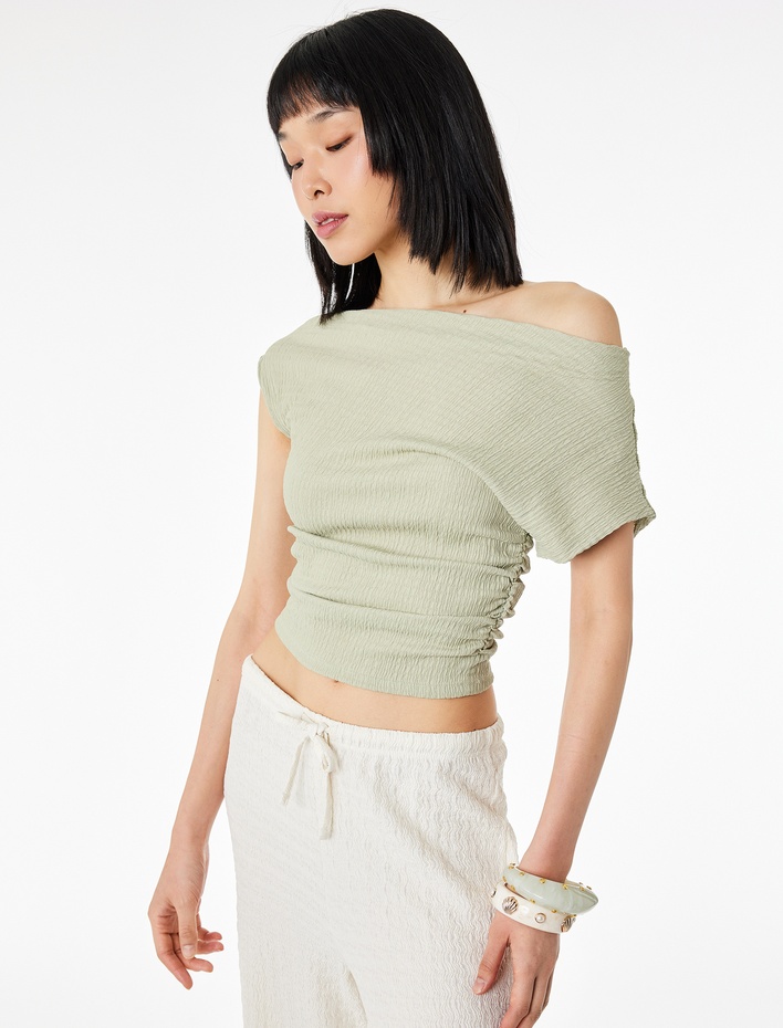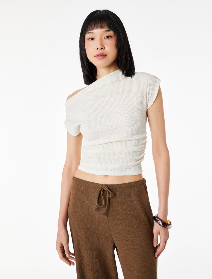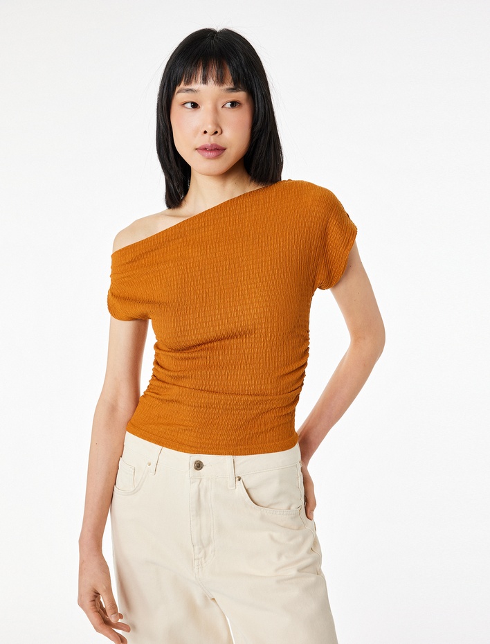 Bürümcük Kumaş Dokulu Drapeli Asimetrik Omzu Açık Kayık Yaka Bluz Sepete Ekle
