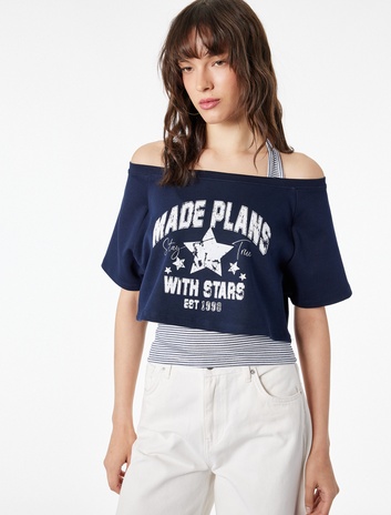 Rahat Kalıp Atlet Detaylı Omzu Açık Kısa Kollu Crop Baskılı Tişört Sepete Ekle