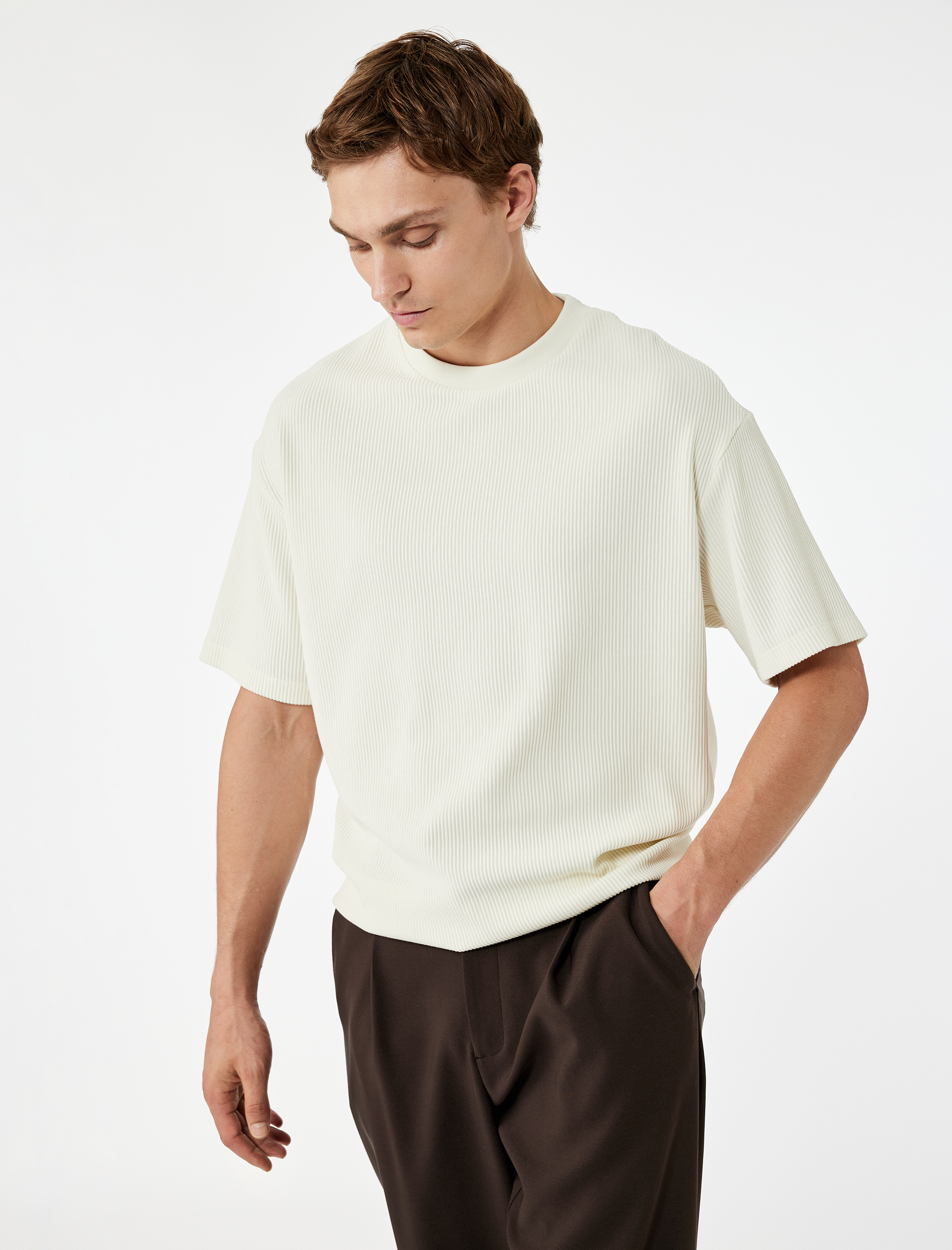 Oversize Kısa Kollu Fitilli Tok Kumaş Bisiklet Yaka Pamuklu Tişört