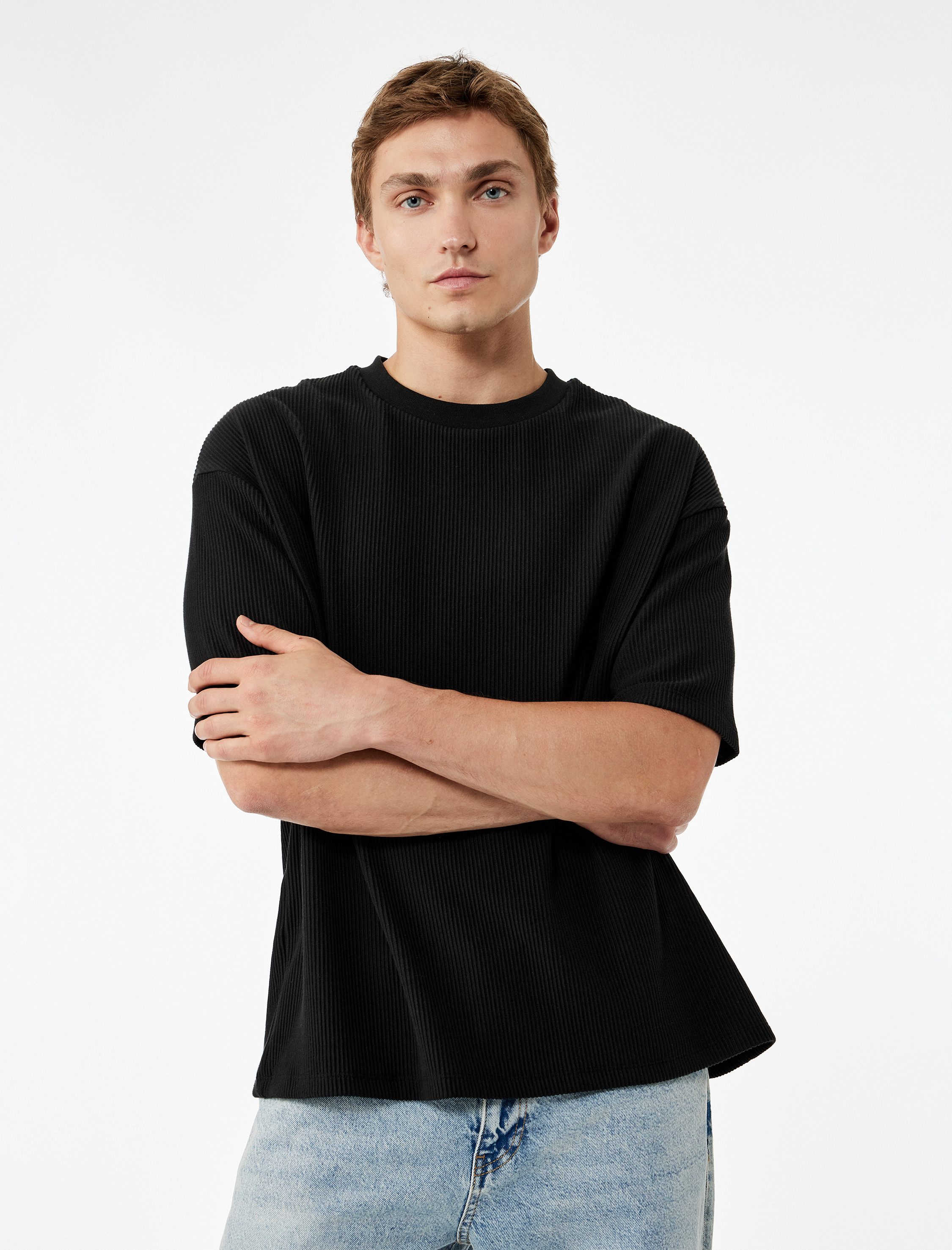 Oversize Kısa Kollu Fitilli Tok Kumaş Bisiklet Yaka Pamuklu Tişört
