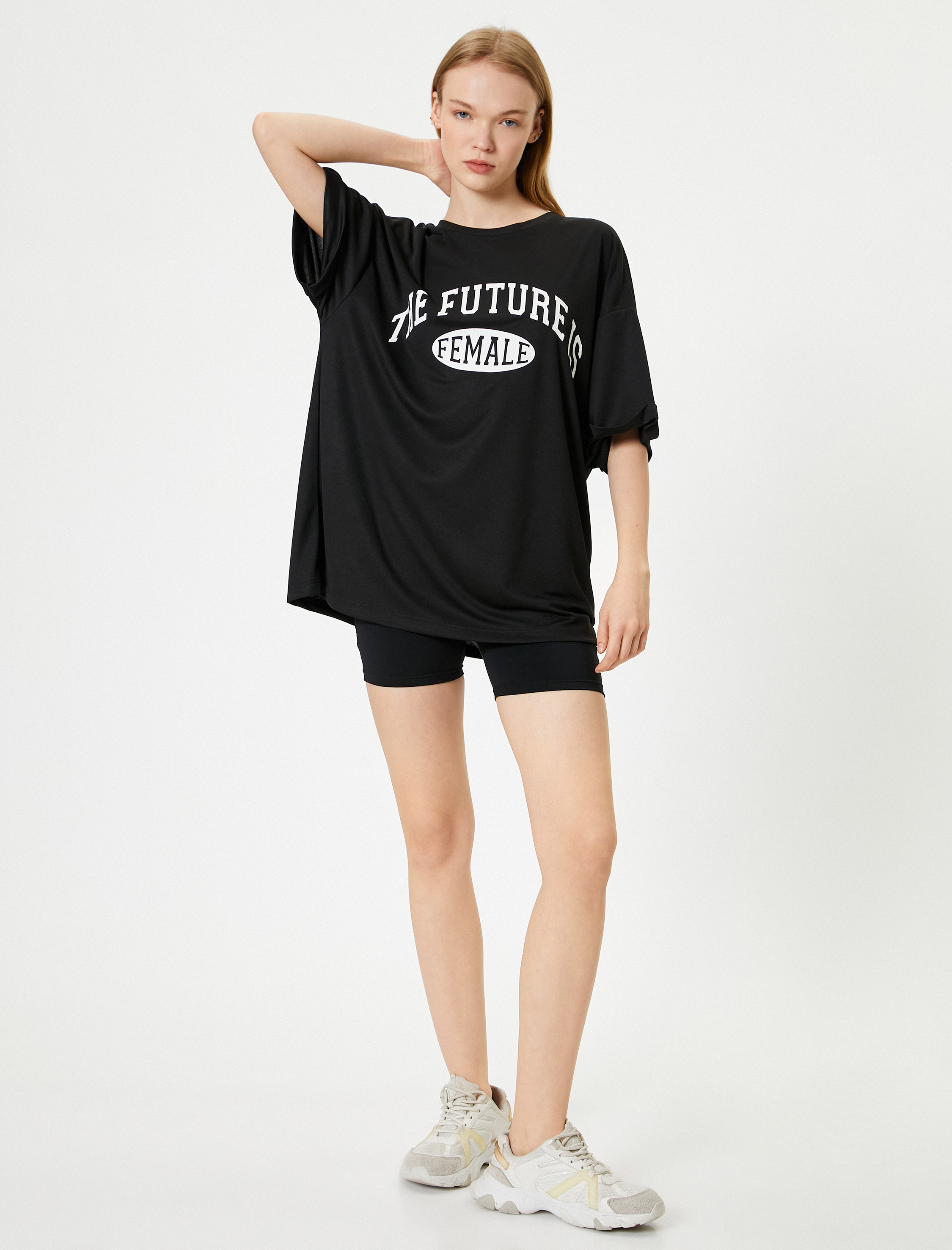 Oversize Tişört Bisiklet Yaka Slogan Baskılı Kısa Kollu