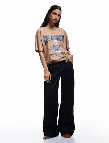 Kısa Kollu Bisiklet Yaka Pamuklu Ayıcık Baskılı Oversize Tişört