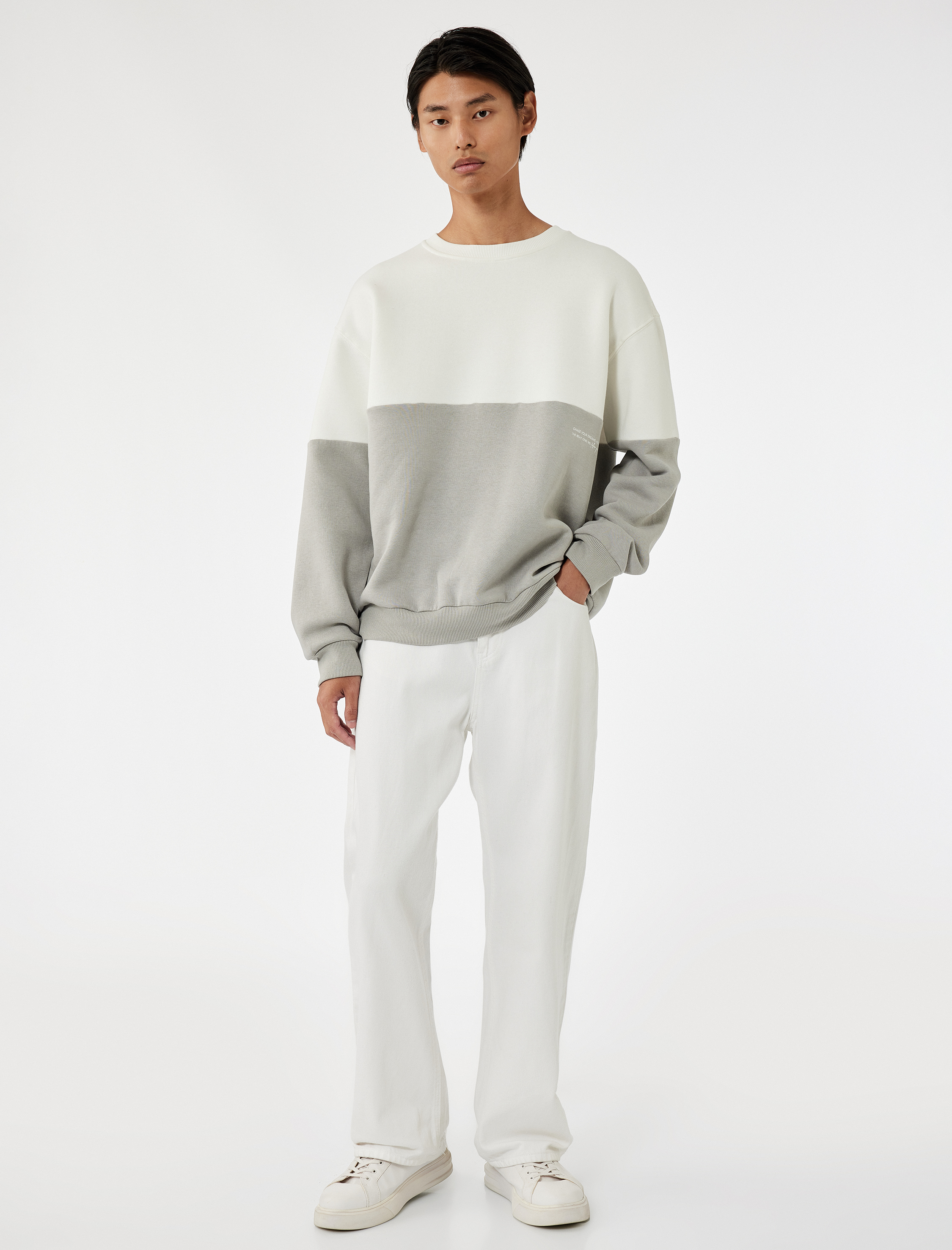 Oversize Uzun Kollu Renk Bloklu Baskı Detaylı Şardonlu Bisiklet Yaka Sweatshirt