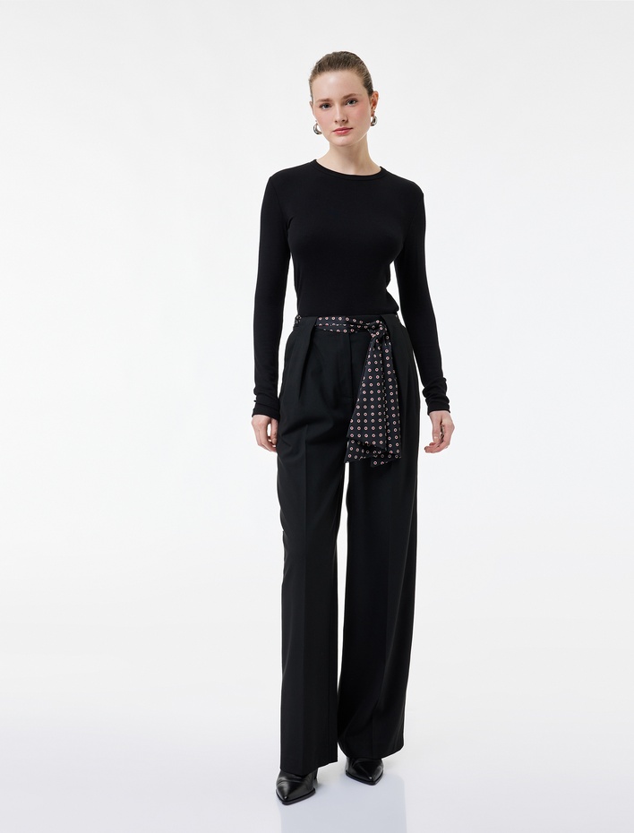 Pile Detaylı Geniş Paça Kemerli Palazzo Pantolon