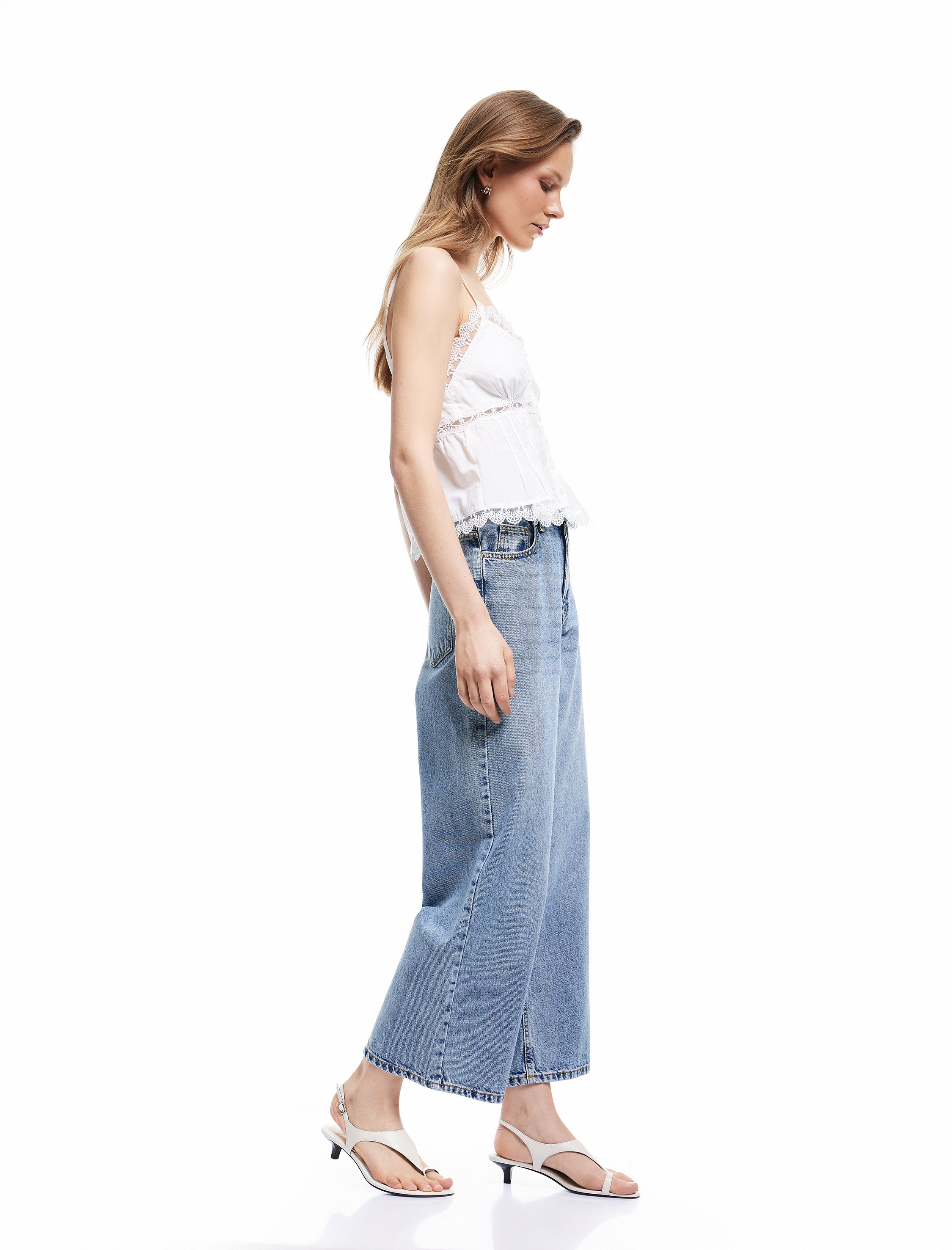 Pamuklu Düğmeli Cepli Normal Bel Crop Geniş Paça Jean Pantolon - Wide Leg Jean