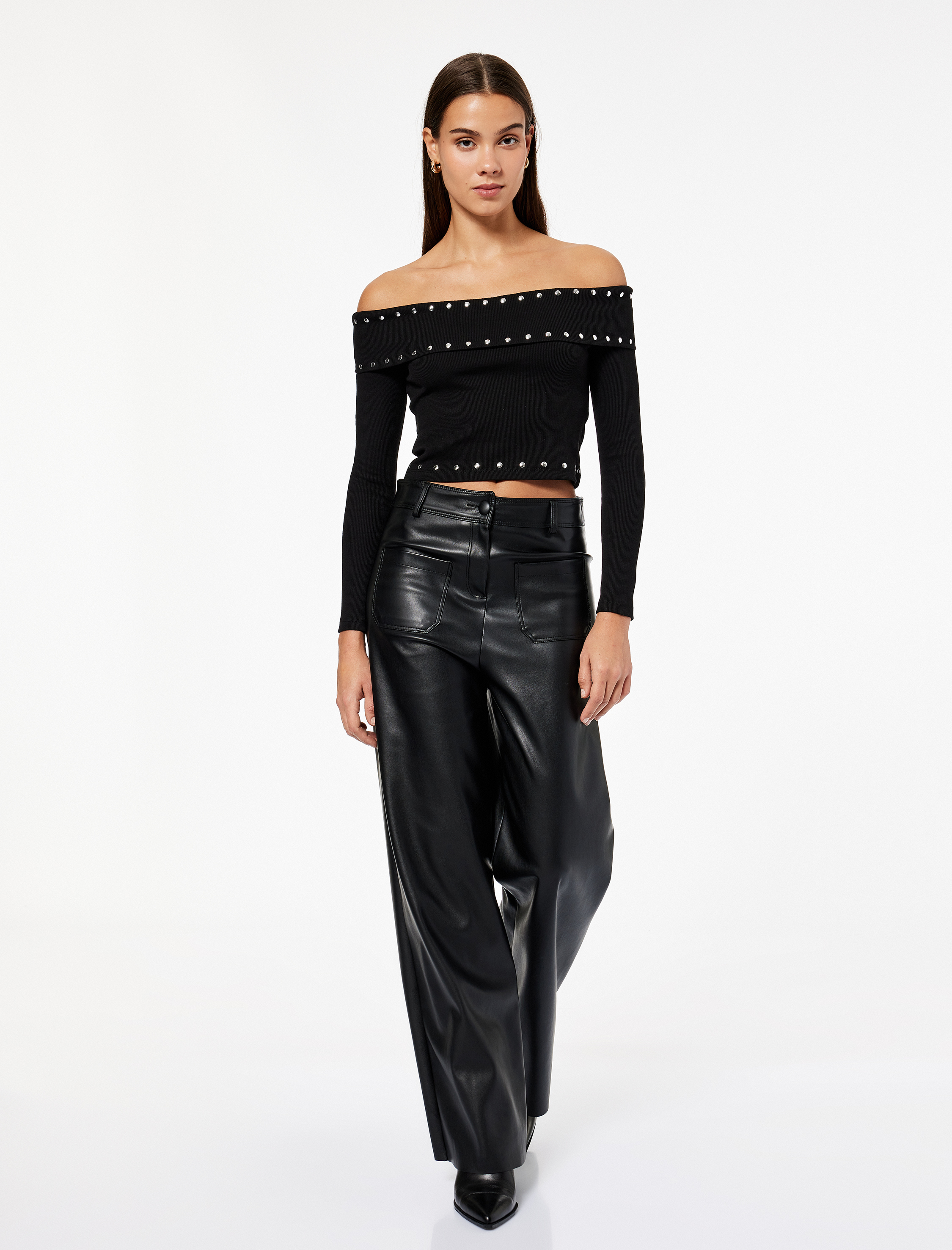 Pamuklu Metal Aksesuarlı Uzun Kollu Omzu Açık Tişört