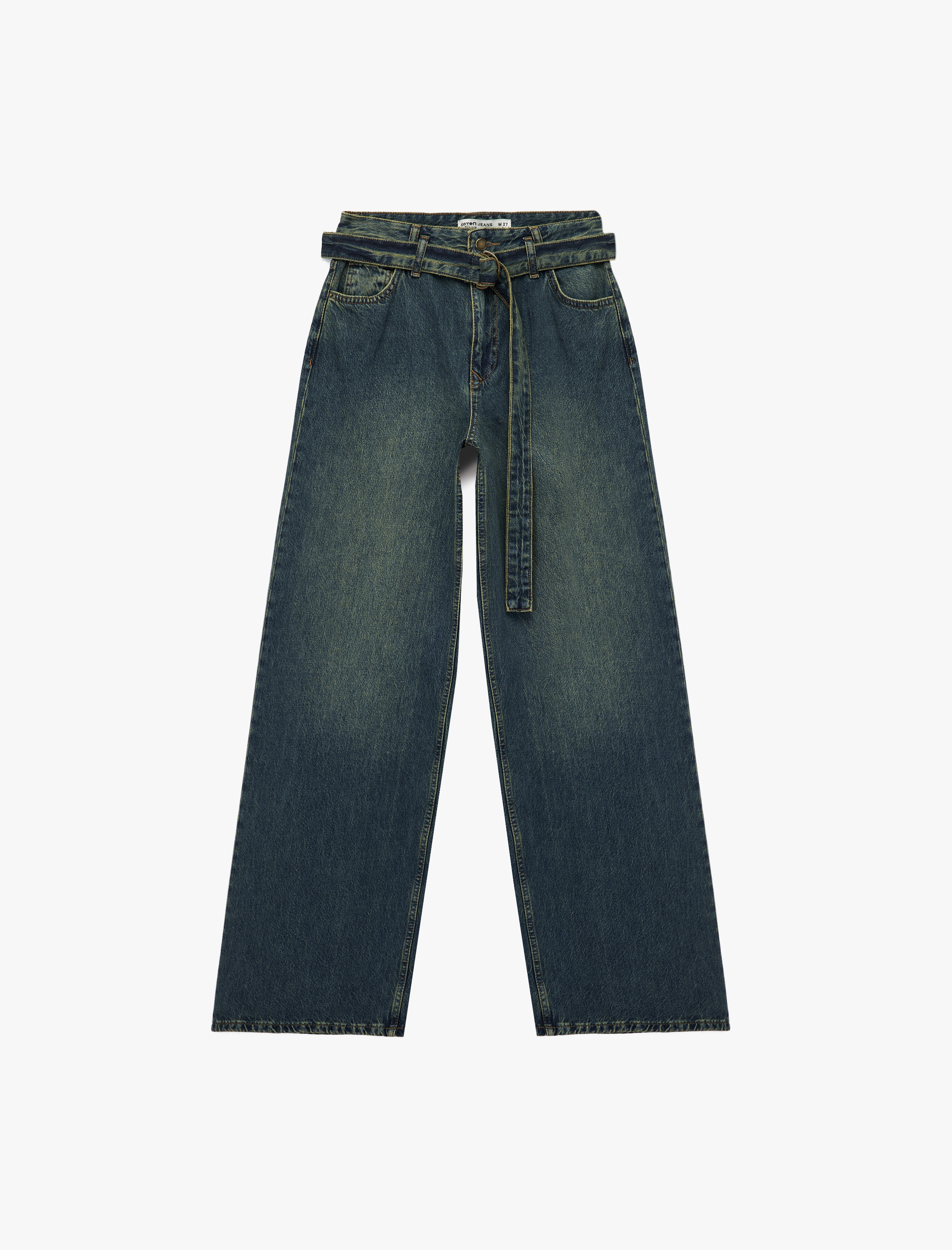 Pamuklu Normal Bel Kemerli Uzun Bol Paça Jean Pantolon - Loose Straight Fit Jean