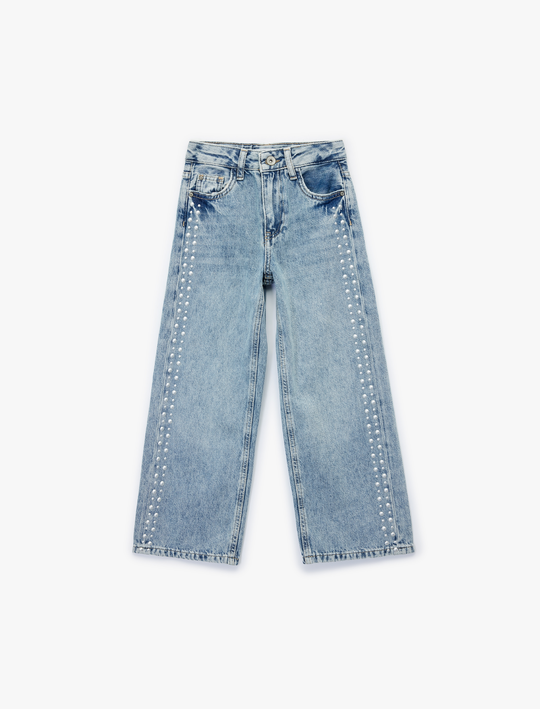Kız Çocuk Pamuklu Rahat Kesim Zımba Detaylı Geniş Paça Denim Pantolon