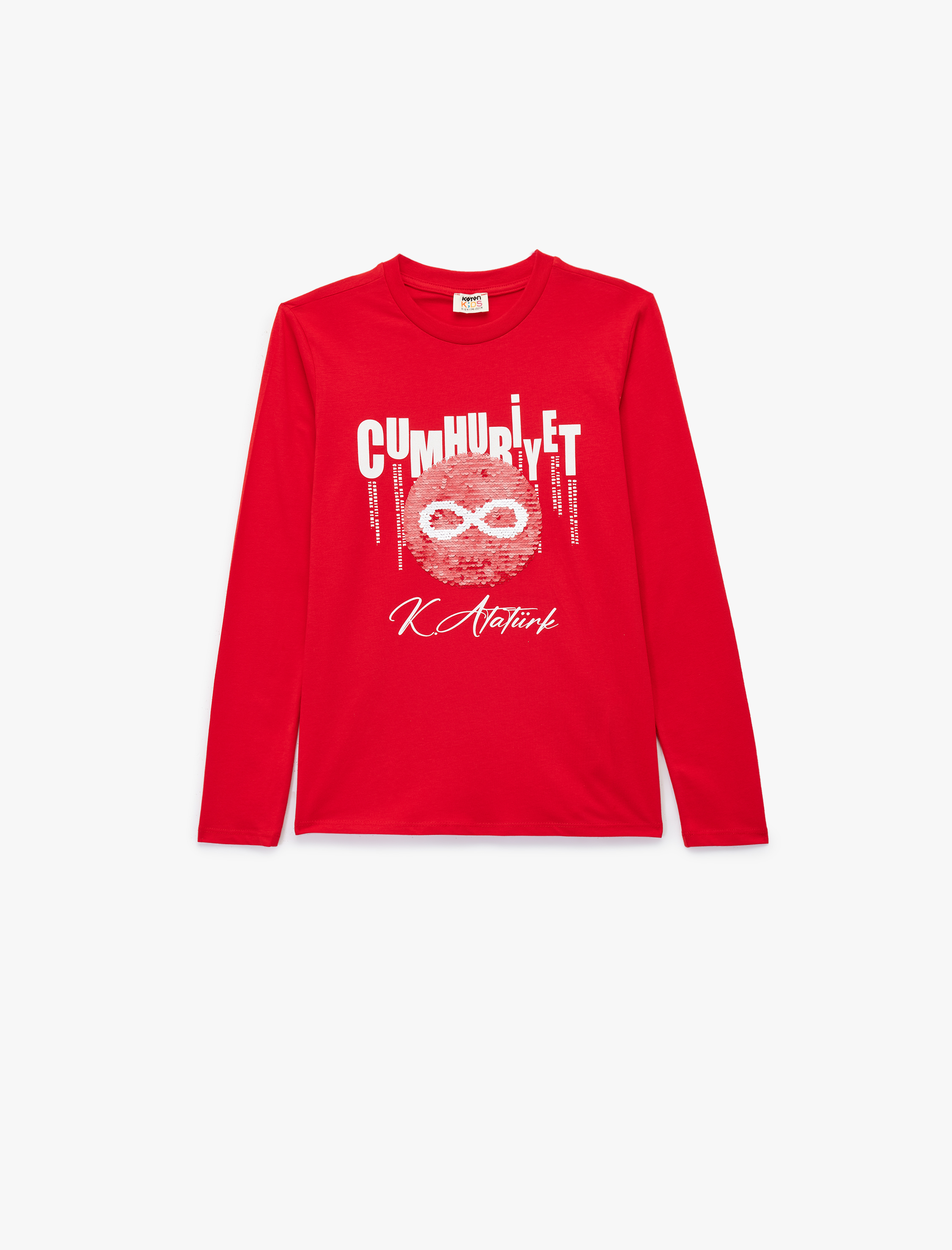 Kız Çocuk Pamuklu Uzun Kollu Pullu Payetli Cumhuriyet ve Atatür İmza Baskılı Tişört