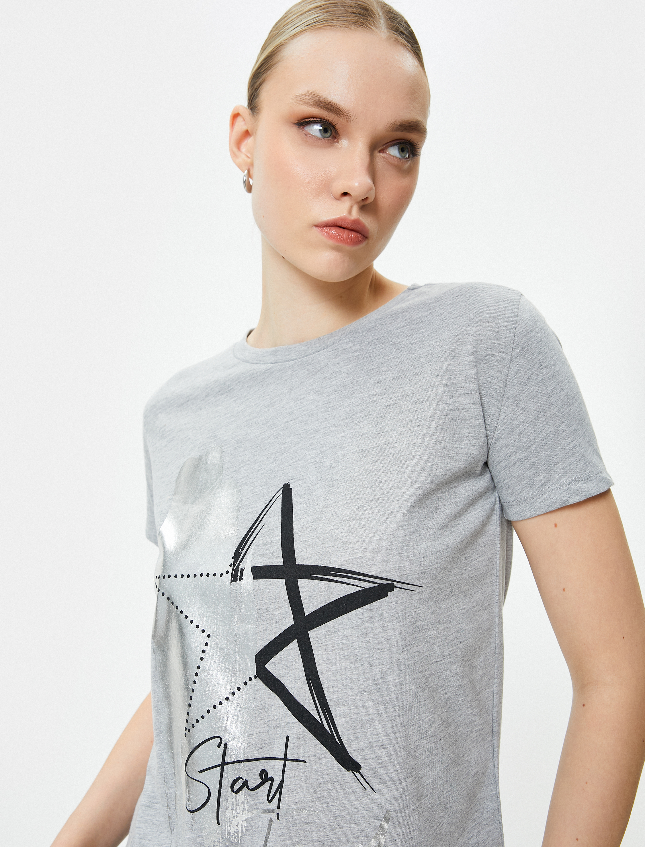 Parlak Slogan Baskılı Tişört Bisiklet Yaka Kısa Kollu