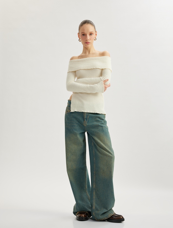 Madonna Yaka Omzu Açık Uzun Kollu Yırtmaç Detaylı Tişört
