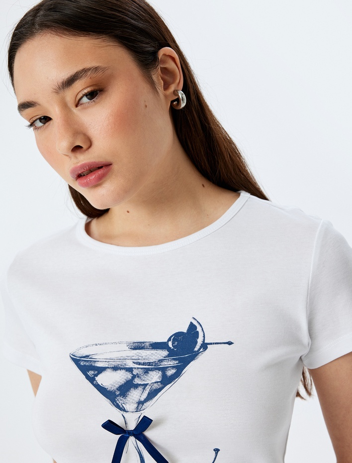 Bisiklet Yaka Baskılı Fiyonk Detaylı Kısa Kollu Tişört Sepete Ekle