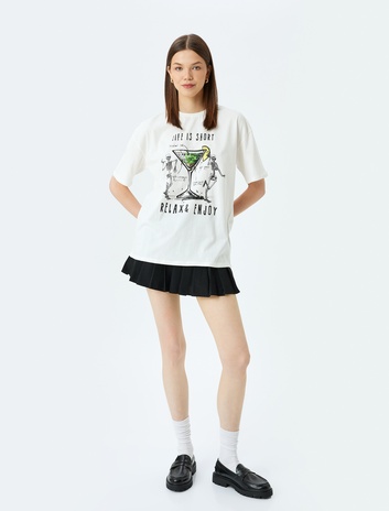 Pamuklu Kısa Kollu Bisiklet Yaka Baskılı Kadın Oversize Tişört
