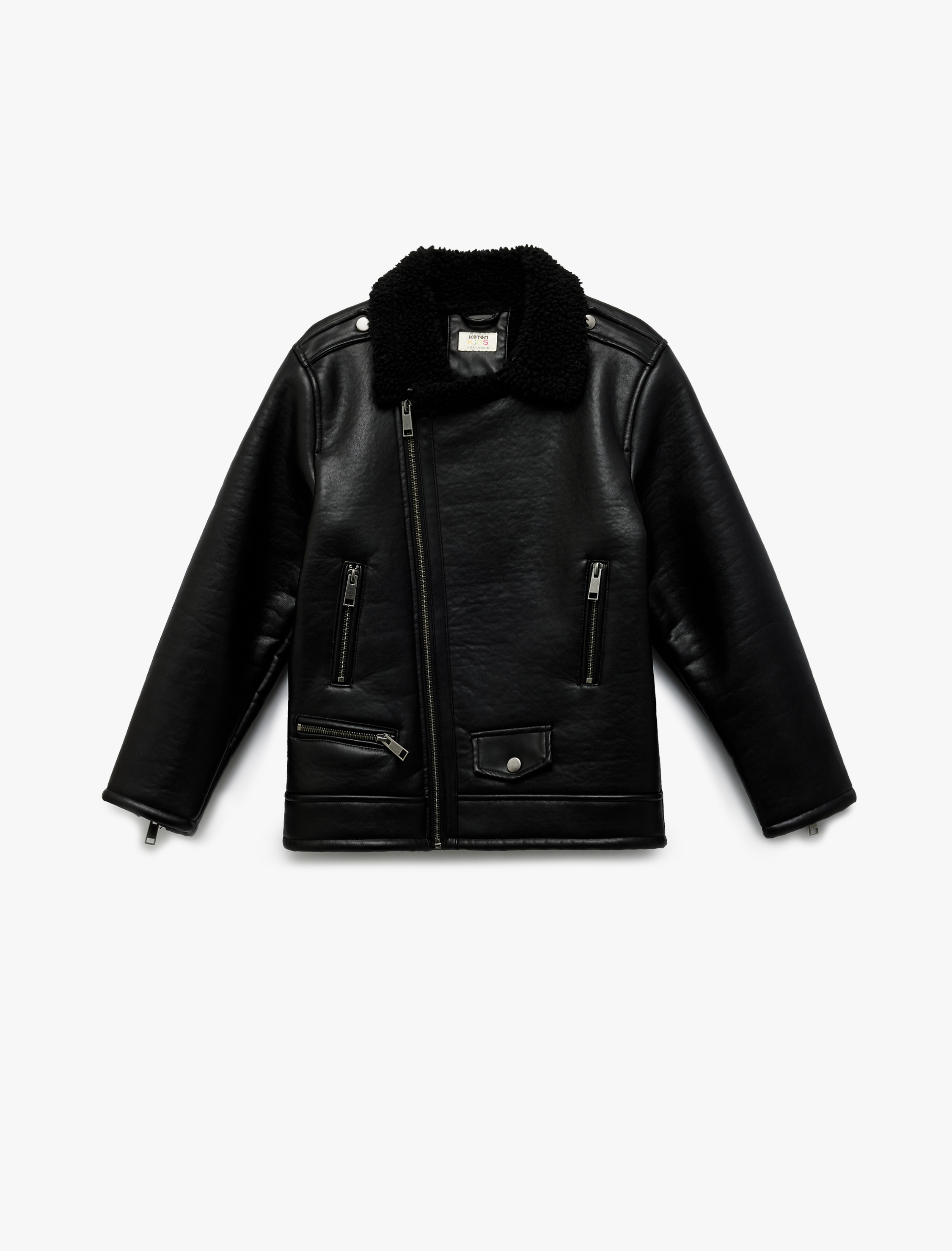 Erkek Çocuk Peluş Detaylı Uzun Kollu Kruvaze Yaka Biker Deri Ceket