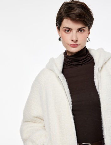 Uzun Kollu Cepli Fermuarlı Kapüşonlu Peluş Ceket