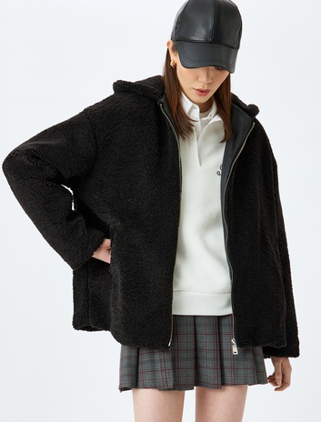 Kapüşonlu Fermuarlı Cep Detaylı Oversize Peluş Ceket Sepete Ekle