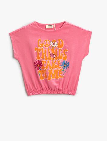 Kız Çocuk Baskılı Crop Tişört Bisiklet Yaka Beli Lastikli Pamuklu