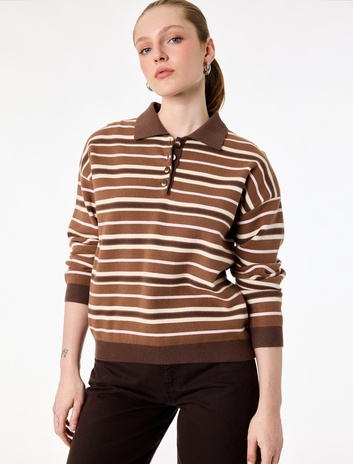 Uzun Kollu Yarım Düğme Detaylı Polo Yaka Çizgili Triko Kazak