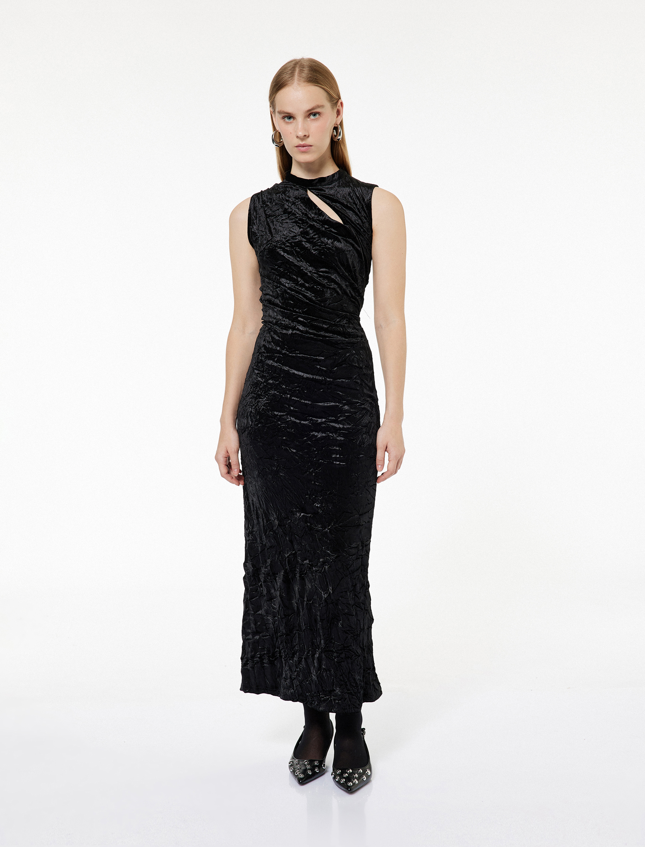 Pencere Detaylı Kolsuz Dik Yaka Uzun Kalem Kadife Elbise