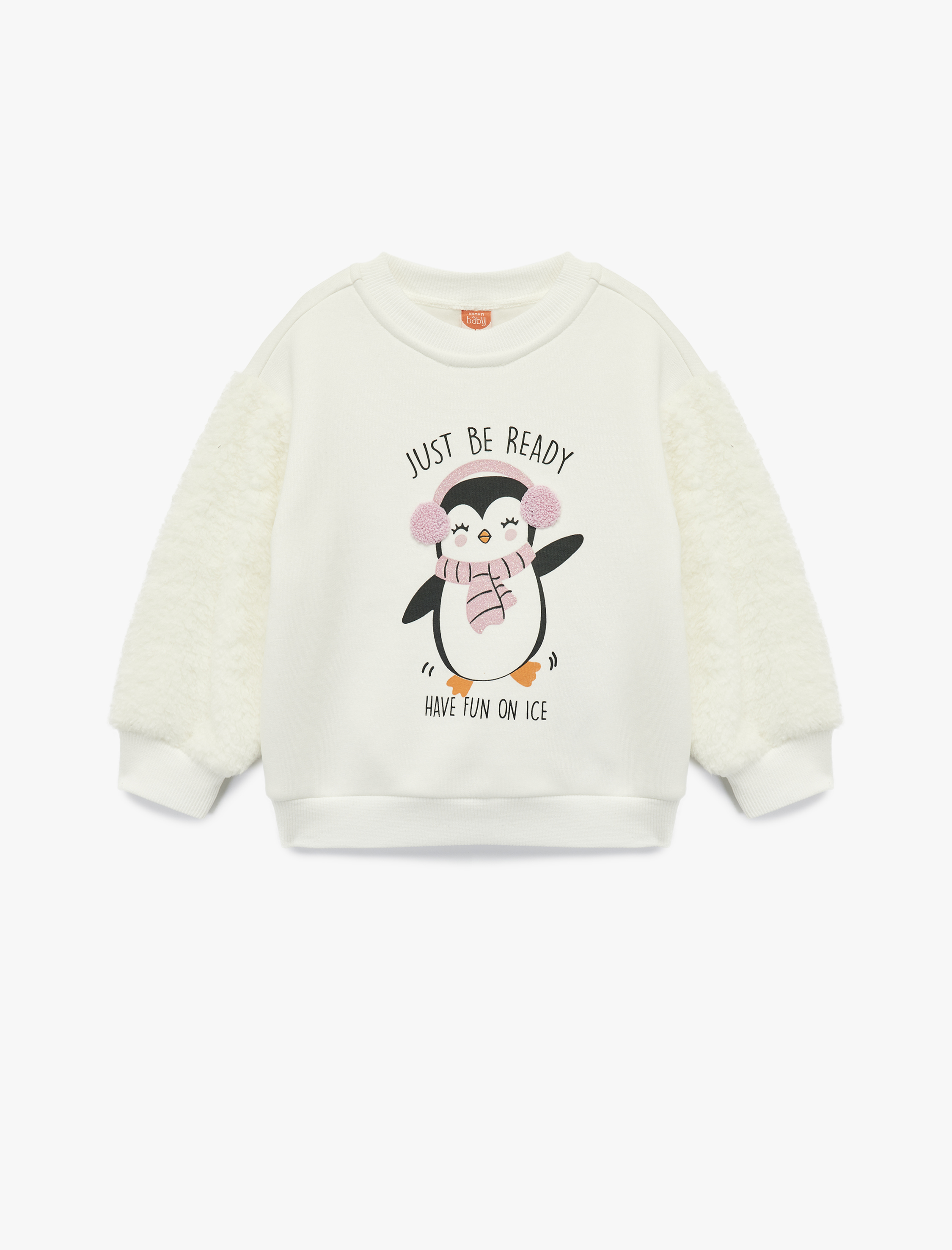 Kız Bebek Penguen Baskılı Uzun Kollu Bisiklet Yaka Pamuklu Sweatshirt