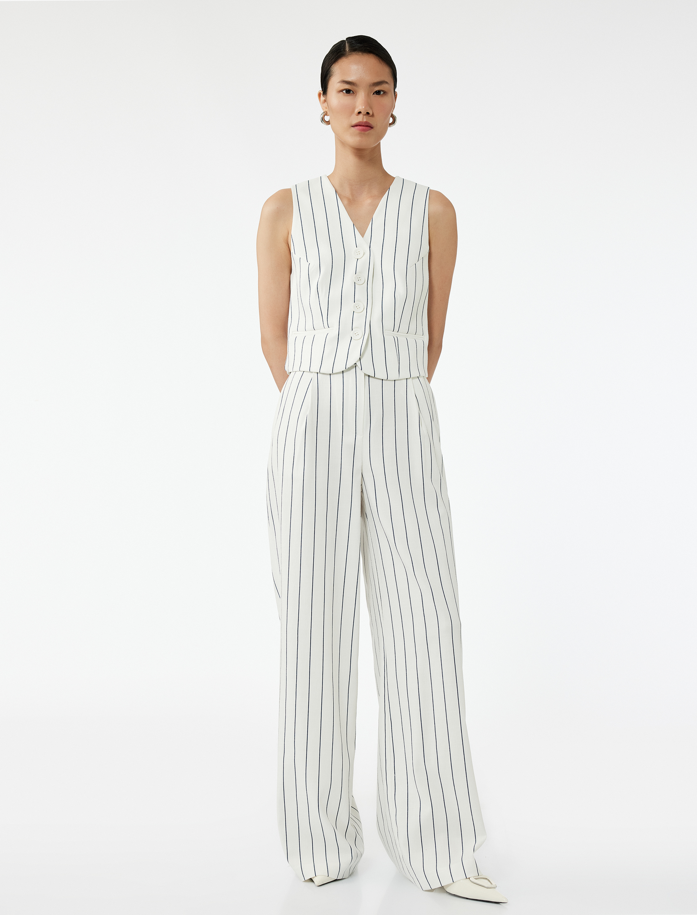 Pileli Çizgili Viskon Karışımlı Geniş Paça Pantolon