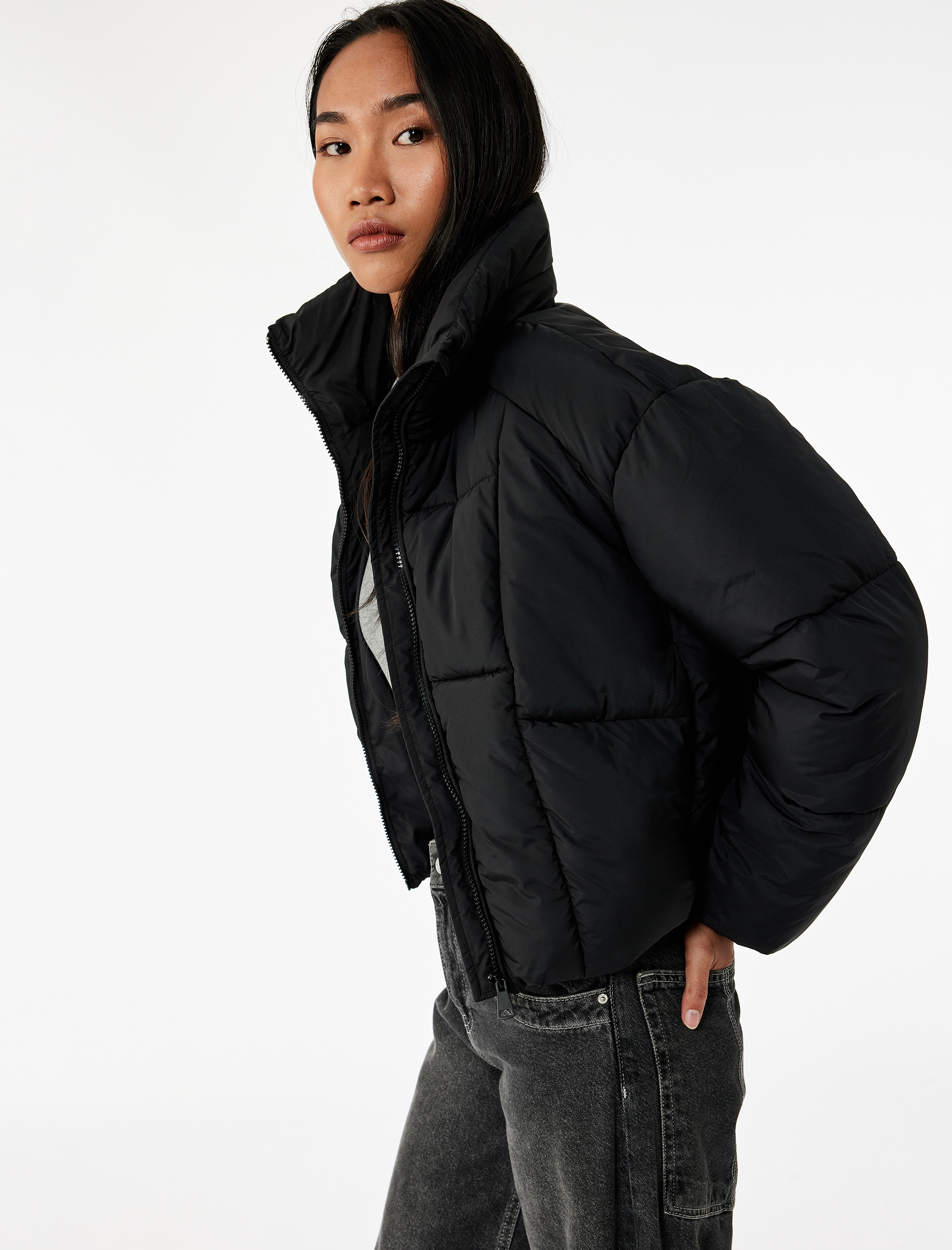 Polar Cepli Dik Yaka Uzun Kollu Fermuarlı Su İtici Crop Şişme Mont