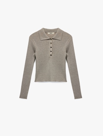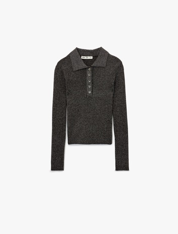Koton X Melis Ağazat - Uzun Kollu Metalik İplik Detaylı Parıltılı Polo Yaka Triko Kazak Sepete Ekle