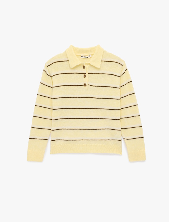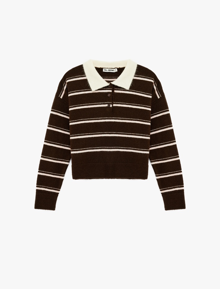 Düğmeli Uzun Kollu Polo Yaka Çizgili Triko Kazak Sepete Ekle