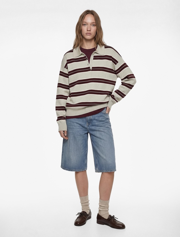 Düğmeli Polo Yaka Uzun Kollu Çizgili Kazak Sepete Ekle