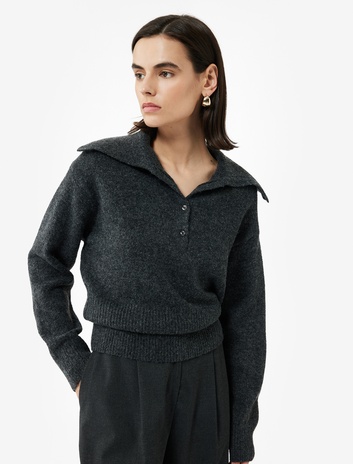 Regular Fit Uzun Kollu Yarım Düğme Detaylı Geniş Polo Yaka Triko Kazak Sepete Ekle