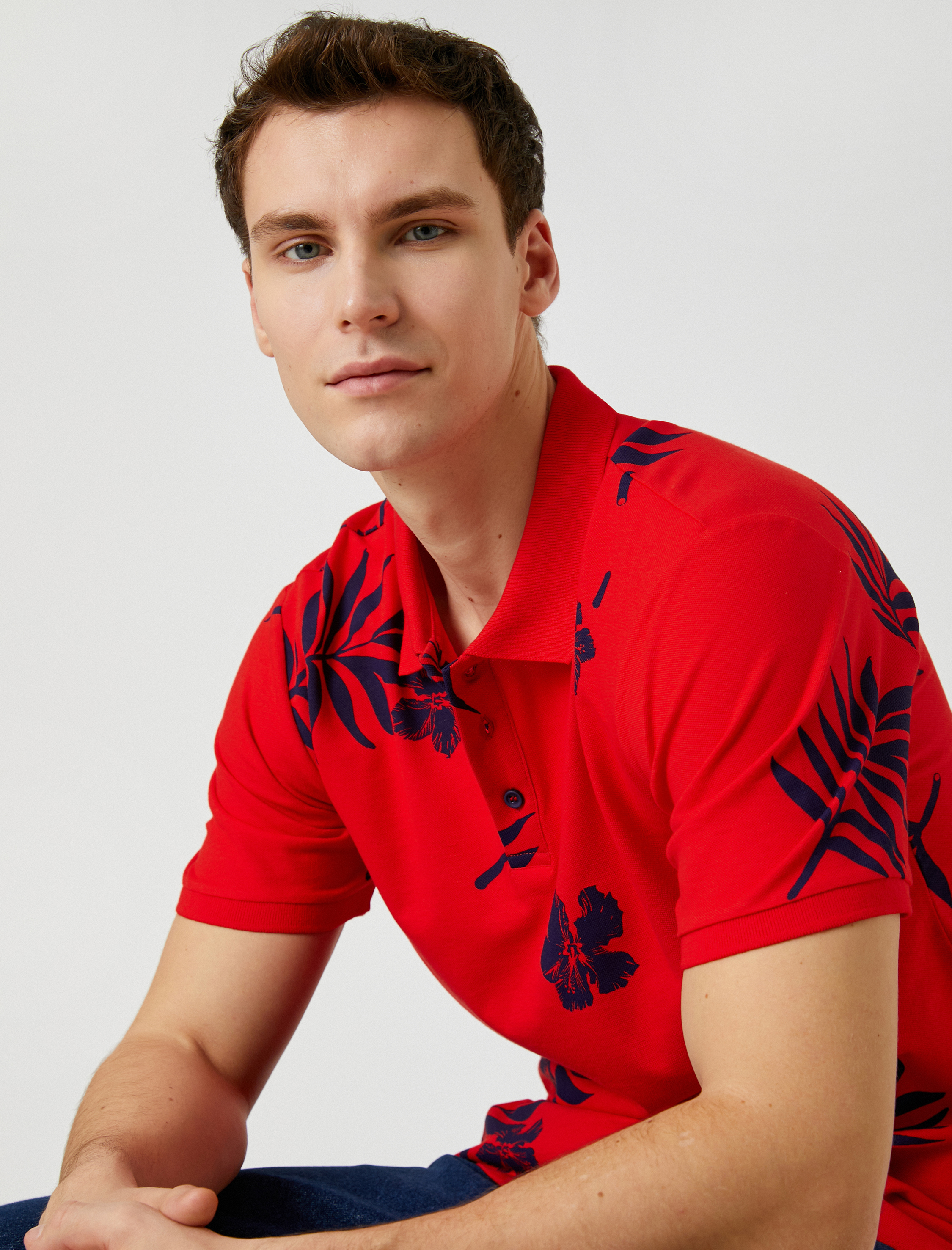 Polo Yaka Tişört Yaprak Baskılı Düğmeli Dar Kesim Kısa Kollu