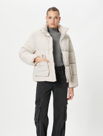 Kısa Şişme Mont Dik Yaka Büyük Cepli Çıtçıtlı