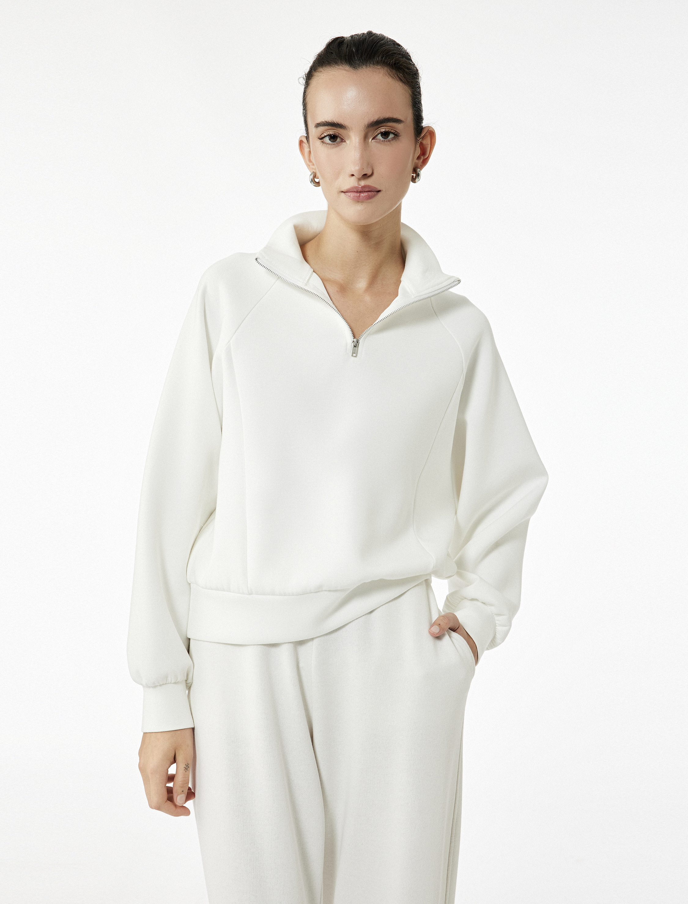 Rahat Kalıp Modal Kumaş Uzun Kollu Dik Yaka Yarım Fermuarlı Sweatshirt