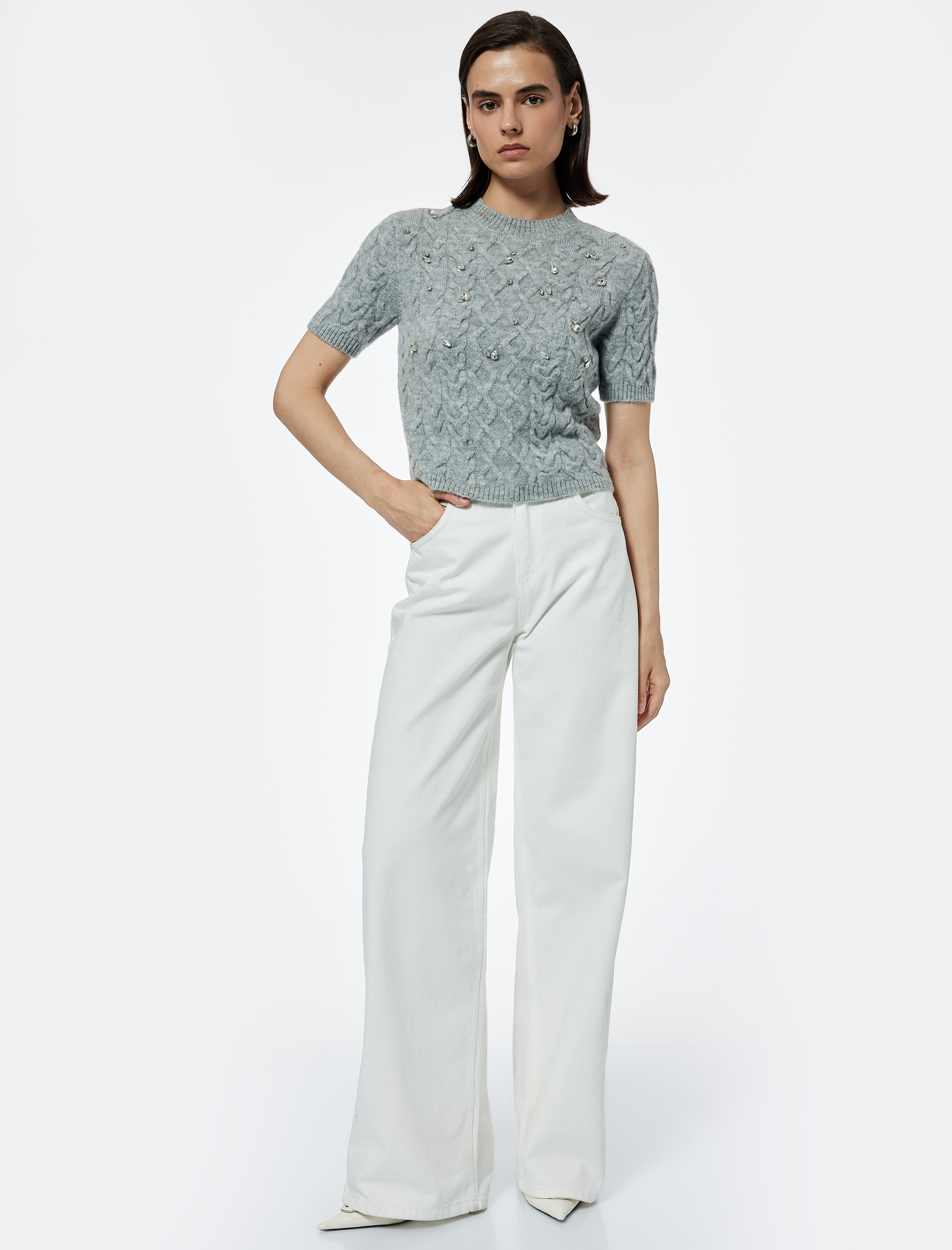 Regular Fit Kısa Kollu Bisiklet Yaka Taşlı Saç Örgü Kazak