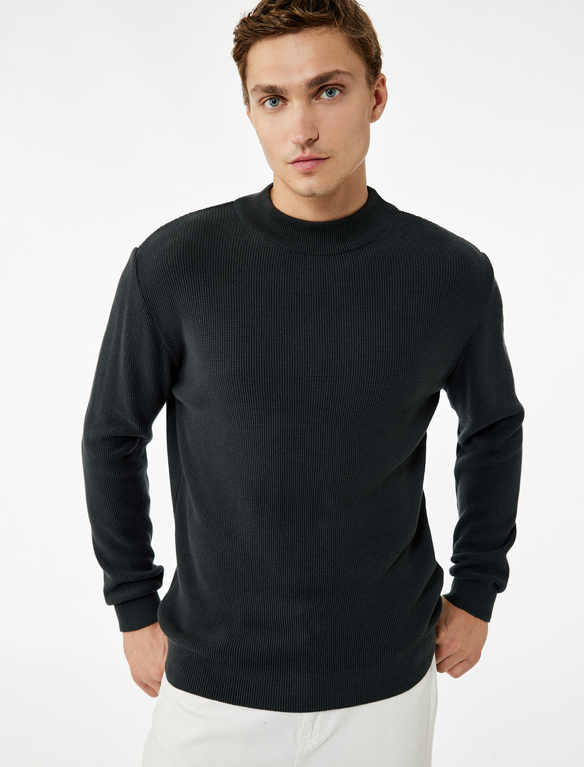 Regular Fit Uzun Kollu Dokulu Pamuklu Dik Yaka Triko Kazak