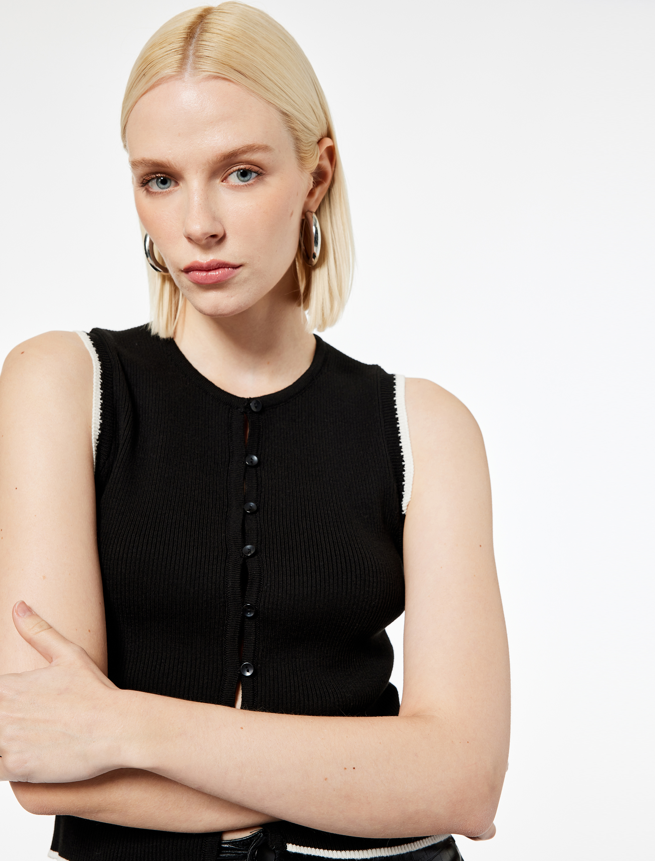 Renk Kontrast Detaylı Düğmeli Bisiklet Yaka Triko Yelek