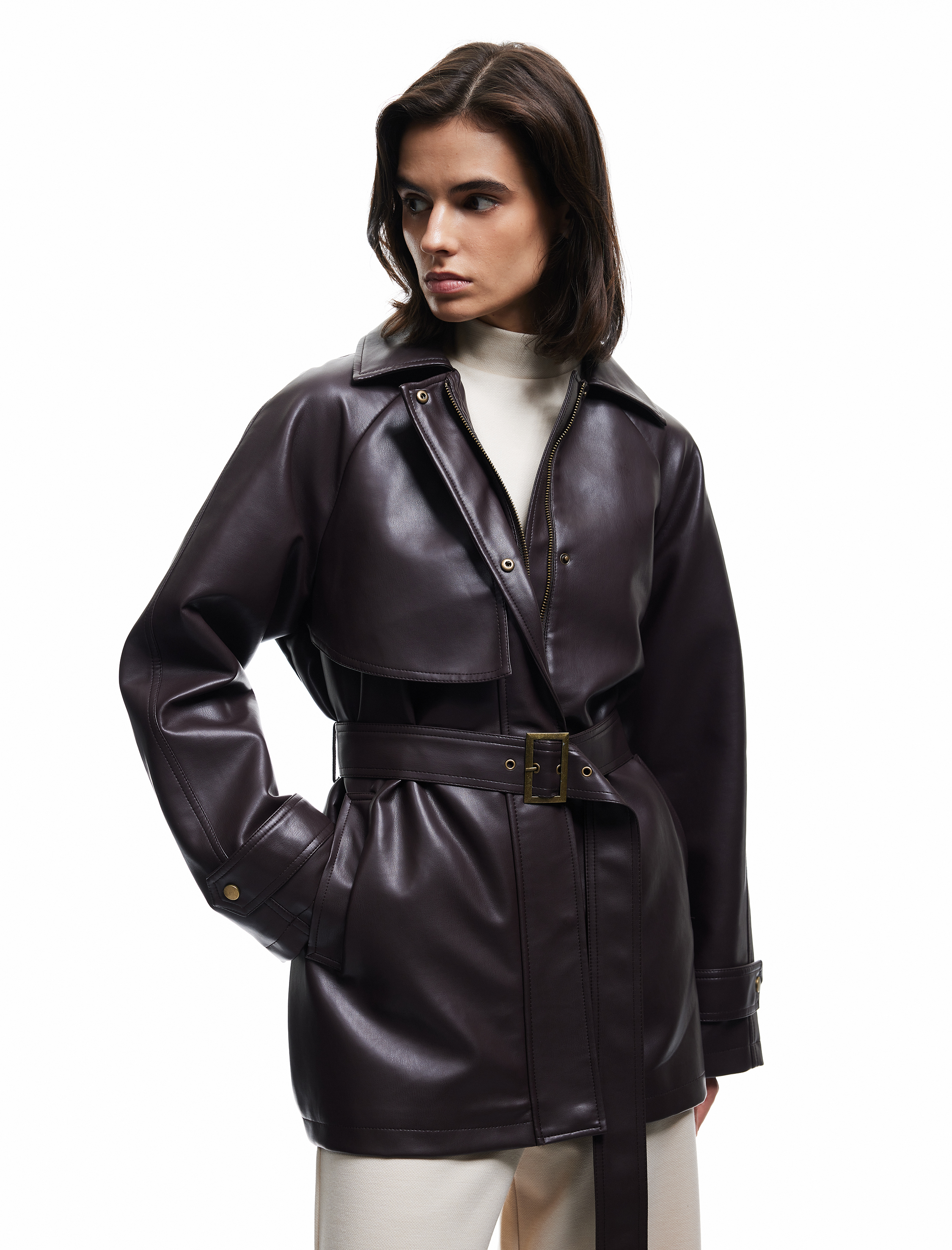 Rüzgar Kapak Detaylı Cepli Kemerli Uzun Kollu Suni Deri Ceket
