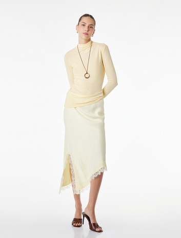 { "item_name": "Slim Fit Yırtmaçlı Asimetrik Kesim Dantel Detaylı Midi Saten Etek", "item_id": "8684969077055", "price": 1699.99 , "item_brand": "Koton", "item_category":"CITY FASHION", "item_category2":"CITY FASHION", "item_category3":"WOMEN", "item_category4":"WOVEN BOTTOMS", "item_category5":"SKIRTS", "item_season":"2026 SPRING/SUMMER", "item_variant": "SARI|40", "item_list_name":"Kadın - Butter Yellow - Dinamik", "item_list_id":"4524", "index": 458 , "quantity":1, "base_code": "6SAK70182PW" }
