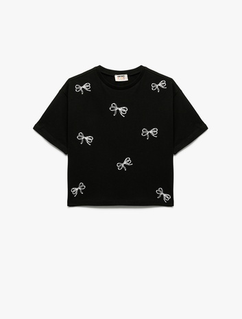 Pamuklu Bisiklet Yaka Fiyonk Baskılı Kısa Kollu Tişört Sepete Ekle