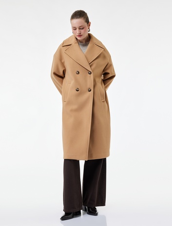 Uzun Kruvaze Kaşe Kaban Düğmeli Cepli