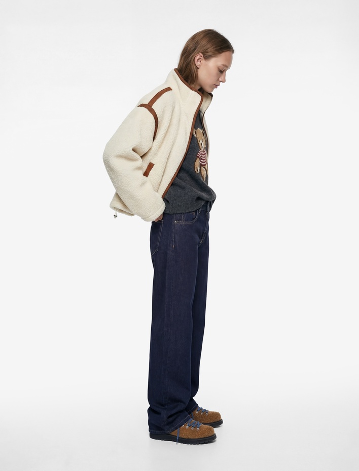 Dik Yaka Cep Detaylı Fermuarlı Oversize Peluş Ceket