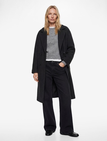 Uzun Kollu Dik Yaka Düğmeli Kruvaze Kaşe Ceket