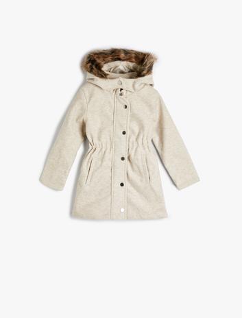Kız Çocuk Kapşonlu Kaban Suni Kürk Yakalı Büzgü Detaylı Düğmeli Cepli