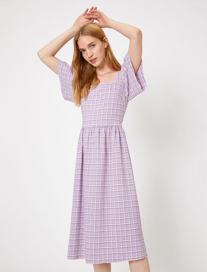 Yırtmaç Detaylı Kareli Kısa Elbise Sepete Ekle