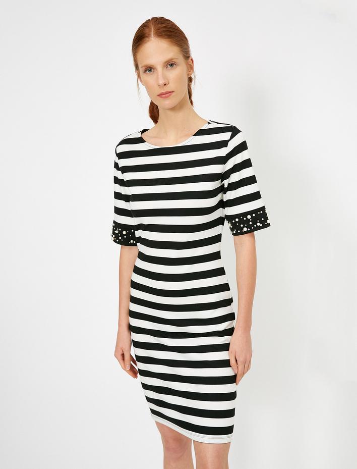 İnci Detaylı Çizgili Elbise