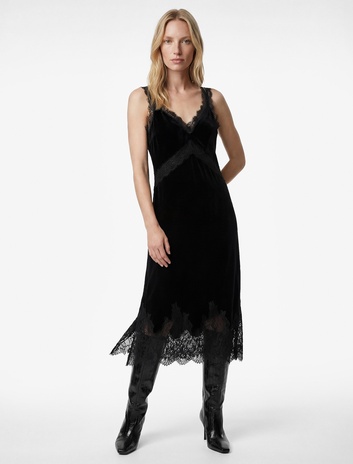 Slim Fit V Yaka Uzun Askılı Dantelli Kadife Elbise Sepete Ekle