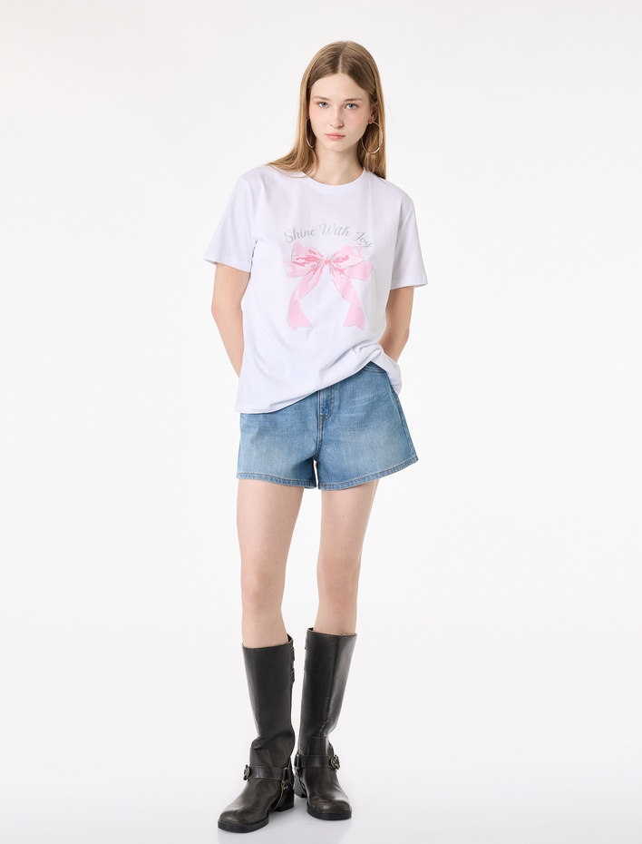 Pamuklu Kısa Kollu Bisiklet Yaka Fiyonk Baskılı Tişört Sepete Ekle