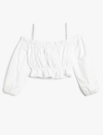 Madonna Yaka Bluz Crop Omzu Açık İnce Askılı Fırfırlı Büzgülü Pamuklu