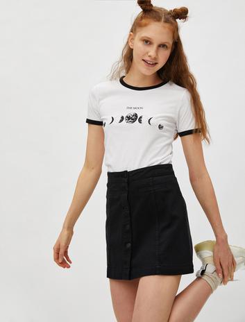 Kısa Kollu Tişört Bisiklet Yaka Baskılı Pamuklu Şerit Detaylı
