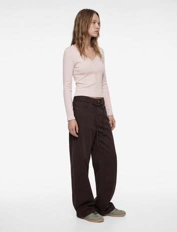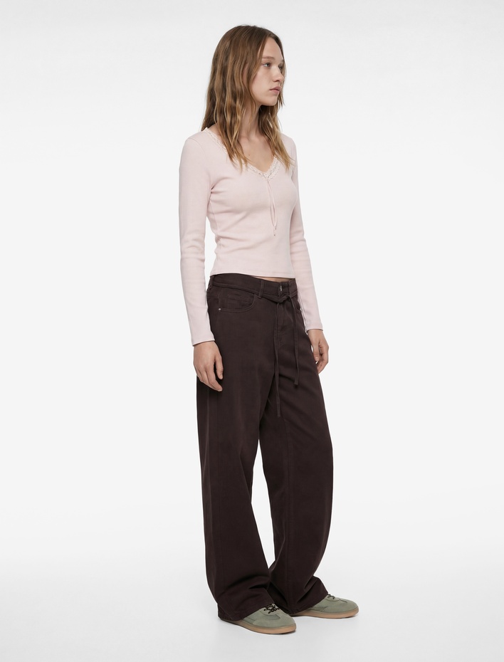 Dantel Detaylı Bağlamalı V Yaka Slim Fit Pamuklu Uzun Kollu Tişört